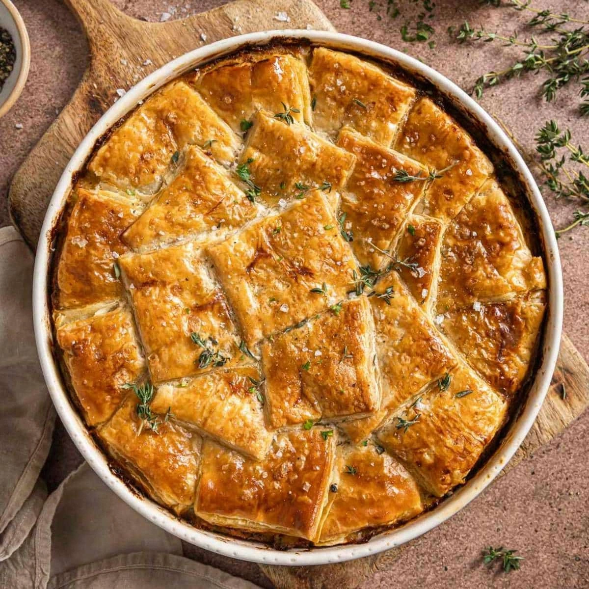 Kitchen Hack: If you’re using a single sheet of puff pastry, fold it in half and cut it into a rectangle that will fit your baking dish. This technique saves time and ensures the pastry covers the filling without excess that would create a messy edge.